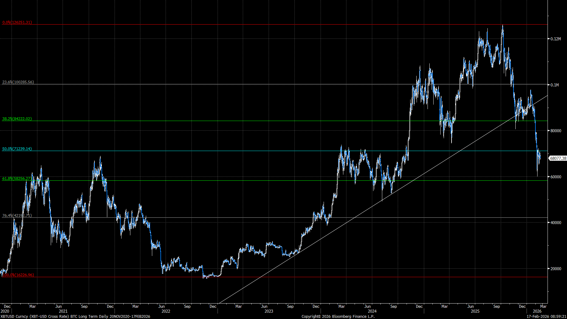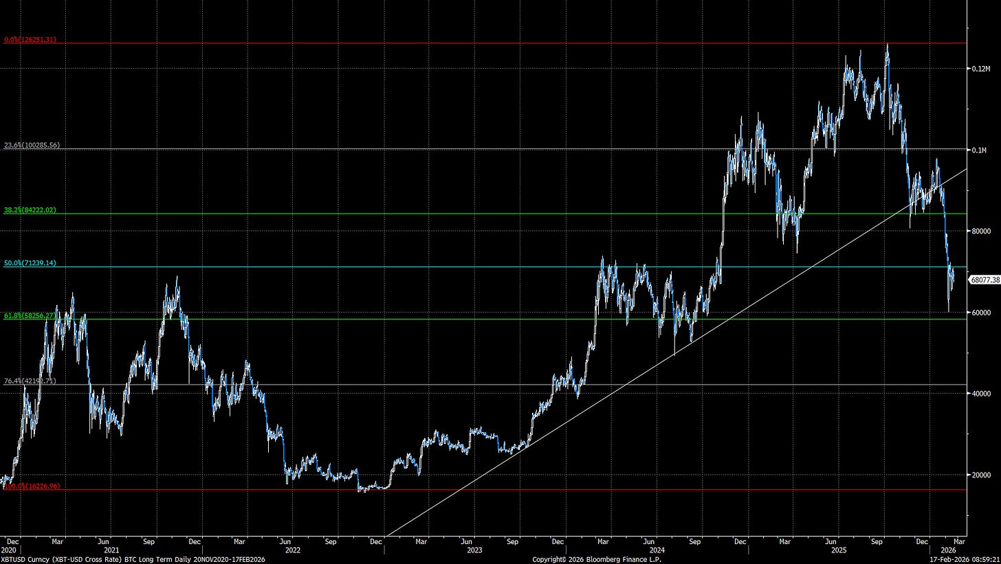 BTC has since bounced from the 60k level and sits below 71.2k resistance.