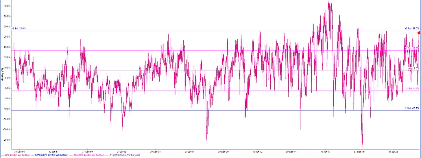 The 2m/6m vol surface is historically steep. As mentioned, some of this is due to the election premium, but not all. We can reduce reliance on election vol by selling an expiry that is just short of the event in October.