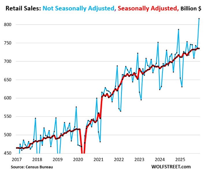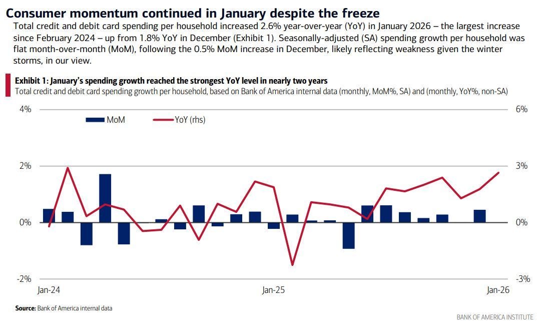 Retail sales was a disappointment and came in flat. Interestingly, we actually had larger than usual seasonal adjustments that may have contributed to that. Every December, the BEA uses seasonal adjustments to reduce the SA number, and then the opposite for January. This is normal, but look at the size of the adjustment vs prior years. The SA was in a pretty consistent range for a number of years, between 60-70BN and this year shot up by 18.8% relative to last year. It is beyond me to say if this is fair or not, but I am pointing out that NSA retail sales put in their best YoY reading in many months, and it was SA sales that were flat. This report stood out relative to other trackers, like Chicago Fed, NRF and Redbook. I think decent chance it gets revised up. BOFA card spending is accelerating to start the year.
