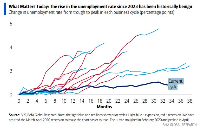 Next up was NFP. This was a blockbuster report in every way I look at it. Not only is the labor market showing clear acceleration, but due to the supply dynamics I have been discussing for a year, it is tightening. Meanwhile, those worried about the labor market need to answer as to why this cycle is the mildest increase in unemployment of any ever and why that justifies more than 175 bps of rate cuts.
