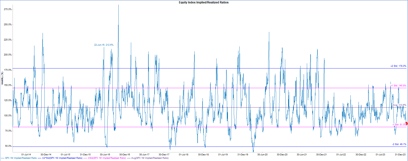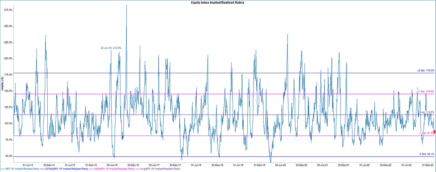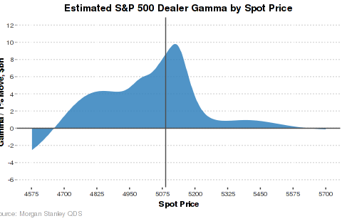 Gamma Scalping. This is a very different approach than directional trading. In this case, option traders are trading the implied/realized ratio of volatility. This is how market makers trade. They do not take directional risk; their job is to take volatility risk. Thus, they are actively hedging their positions to return to a delta neutral position. Below is a chart of 1M implied/realized vol ratio. As shown, implied is typically larger than realized, so it doesn’t usually pay well to be long options expecting large daily moves. In most cases, being short volatility makes sense as long as realized volatility comes in lower than what was implied for the day (it is called earning theta). When the ratio is below 100% as it is now, it is a good deal to buy options and hedge daily once the market moves beyond your breakeven point. The breakeven point is calculated as: (implied volatility)/sqrt(252). Thus, if implied vol is 11.6%, the daily breakeven is 0.73%/day. If you are long, you want a move larger than this before you hedge. If you are short, you are hoping the market delivers smaller moves. Since we know that market makers do not take directional risk, we often want to know what their net gamma position is. That is because if we know they are long gamma, we know they will moderate the market; they will sell rallies and they will buy dips as they hedge their portfolios. If they are short gamma, then we know moves can cascade on each other.