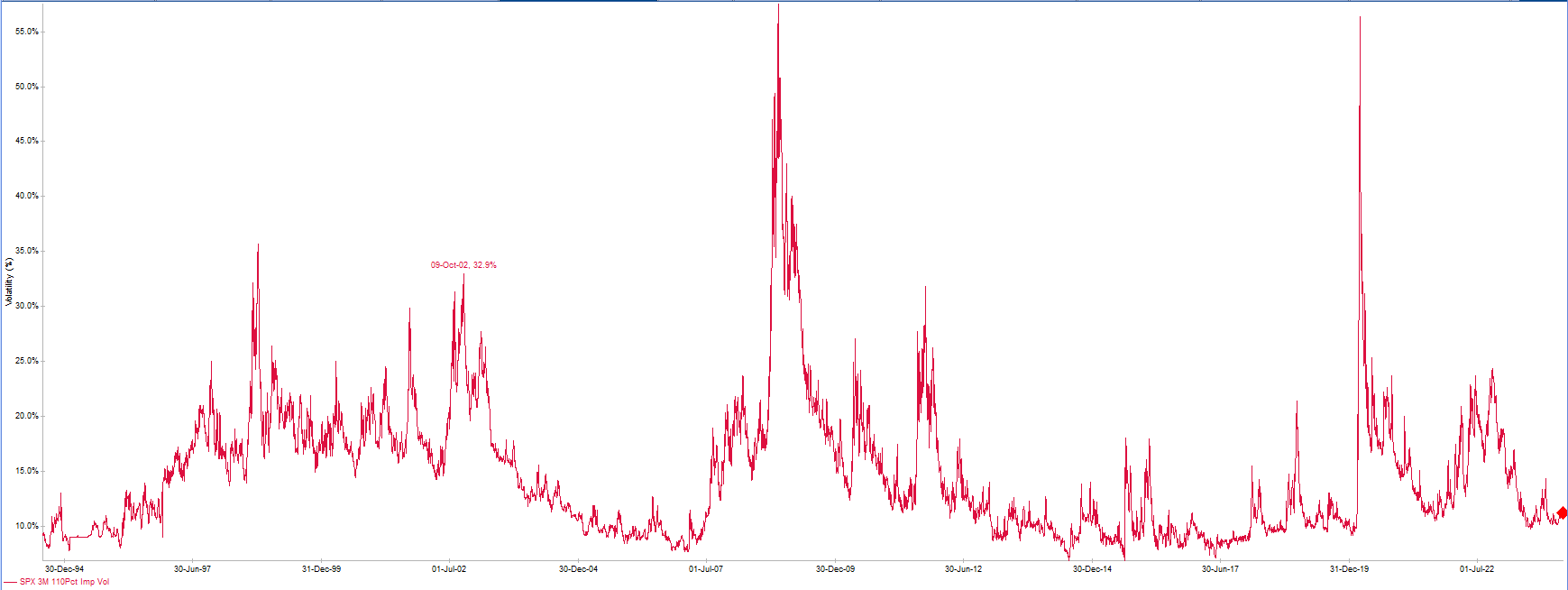 Directional trades. This is the vast majority of options trading. Investors in this case buy calls or puts to express a directional view on a market. When I express directional trades, I look at implied volatility as a tool to express the view. It can either contribute or negate some of the PnL you generate if the move is correct. Thus, it’s important to look at the level of implied vol (is it low or high relative to history) and the directionality of vol (does it rise in declining market or rising market) in order to know if it is a headwind or a tailwind to a trade. Analysis for this type of trading is simple: buy cheap vol, or sell rich vol. A couple rules of thumb: buying OTM options brings more asymmetric upside if you get the direction and move right, and I always recommend buying a maturity longer than the time horizon you are expecting (example: if you think a selloff is imminent, it is tempting to buy a 0DTE or 1 week option, but I would actually recommend a 2week or 1 month trade as it gives you more staying power if you are early. Below is a chart of 3month SPX 110% vol, which looks pretty cheap if you want to express a bullish view on the market.