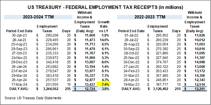 We have very little in terms of data releases this week, with GDP on Thursday and PCE on Friday, which coincides with month end. Most notable events last week were the Fed minutes , where it was confirmed that “various” members discussed rate hikes, as well as PMI and Jobless claims data that beat. While everyone seems to be looking for a slowdown, I have been making the case that it is unlikely for an income driven economy such as the US to simply fall off a cliff from one month to the next and that the softness in April is a one-off. In fact, tax receipts do demonstrate that April was a much softer month than the prior 2 and in fact resembles January. So far, May is tracking the strongest this year. Thus, we can reasonably conclude April’s softness is more a reflection of tax payments resulting in withdrawn liquidity than anything else, and it seems to be reversing for May.